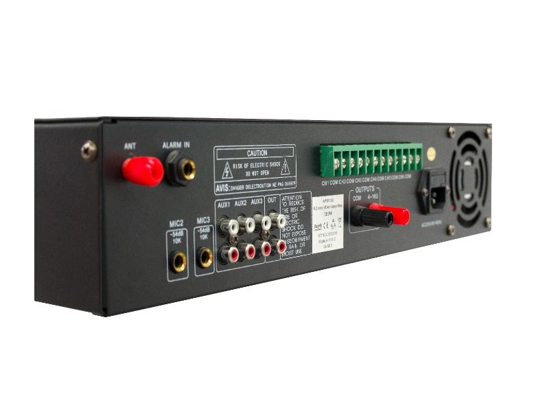 Šest ulaza (3 mikrofona, 3 aux-a). Izlaz niske impedanse od 4-16 Ω, 70/100V. Kontrola 6 zona, visokih tonova i basa, zaštita od kratkog spoja, opcija MUTE. Alarmni izlaz. Multi player opcije: pauza, biranje gornje i donje pesme, selekcija jačine zvuka, MP3 ili WMA format dokumenta. Daljinski upravljač.