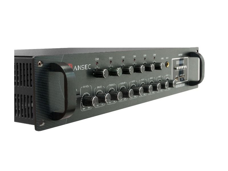 Šest ulaza (3 mikrofona, 3 aux-a). Izlaz niske impedanse od 4-16 Ω, 70/100V. Kontrola 6 zona, visokih tonova i basa, zaštita od kratkog spoja, opcija MUTE. Alarmni izlaz. Multi player opcije: pauza, biranje gornje i donje pesme, selekcija jačine zvuka, MP3 ili WMA format dokumenta. Daljinski upravljač.